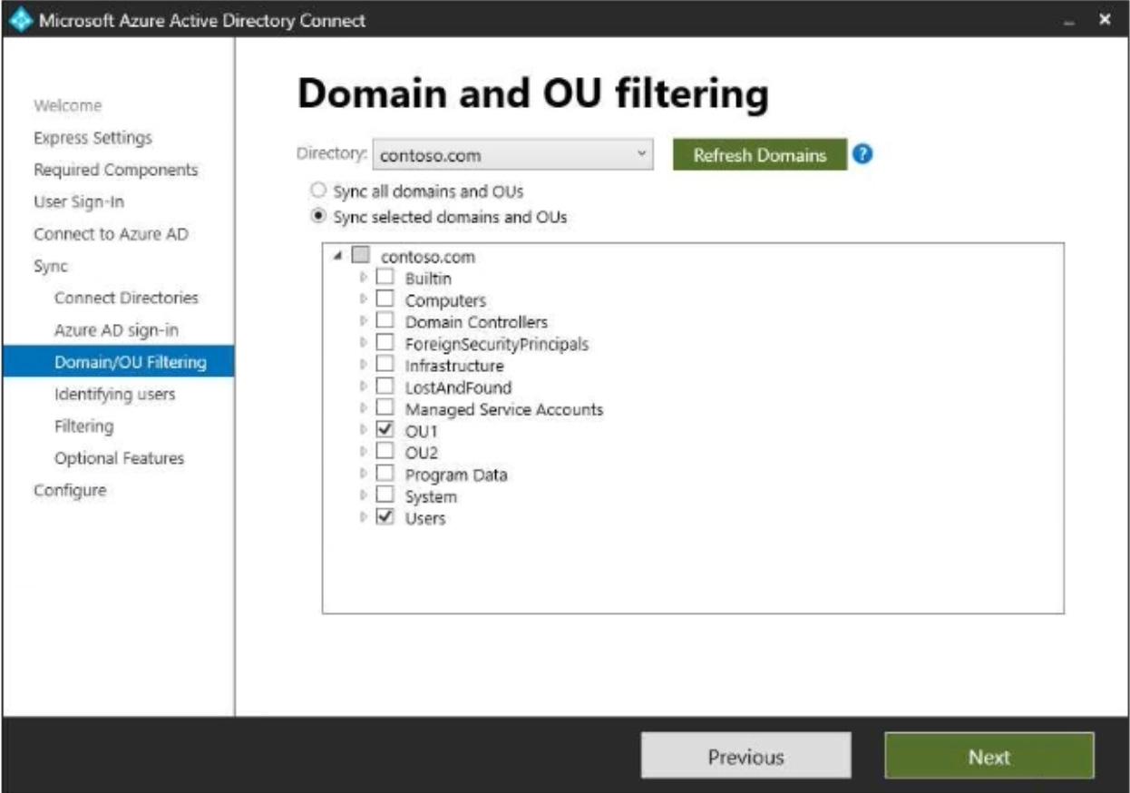 In Azure AD Connect, Domain/OU Filtering is configured as shown in the following exhibit.