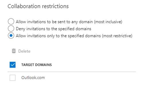 From the External collaboration settings in the Azure Active Directory admin center, you configure the Collaboration restrictions settings as shown in the following exhibit.