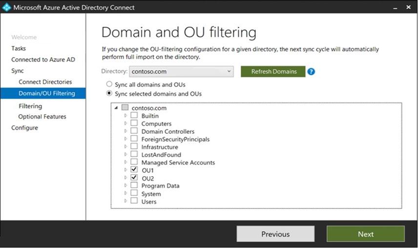 You install Azure AD Connect. You configure the Domain and OU filtering settings as shown in the Domain and OU Filtering exhibit. (Click the Domain and OU
