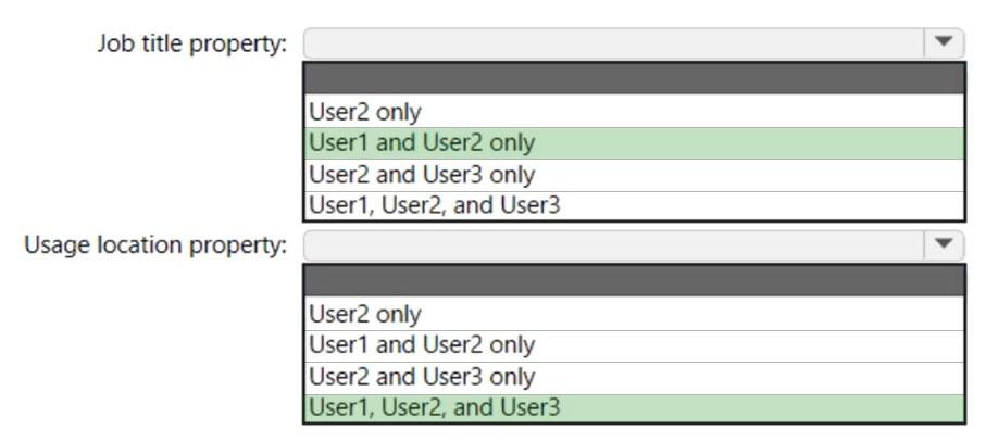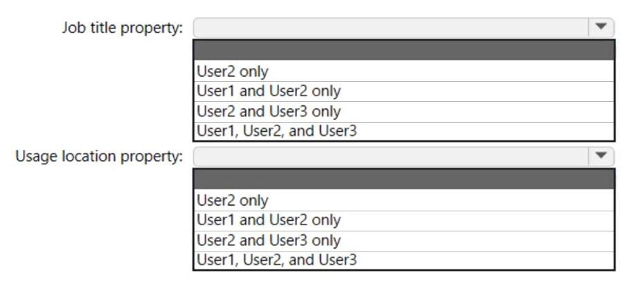 For which users can you configure the Job title property and the Usage location property in Azure AD? To answer, select the appropriate options in the answer area.