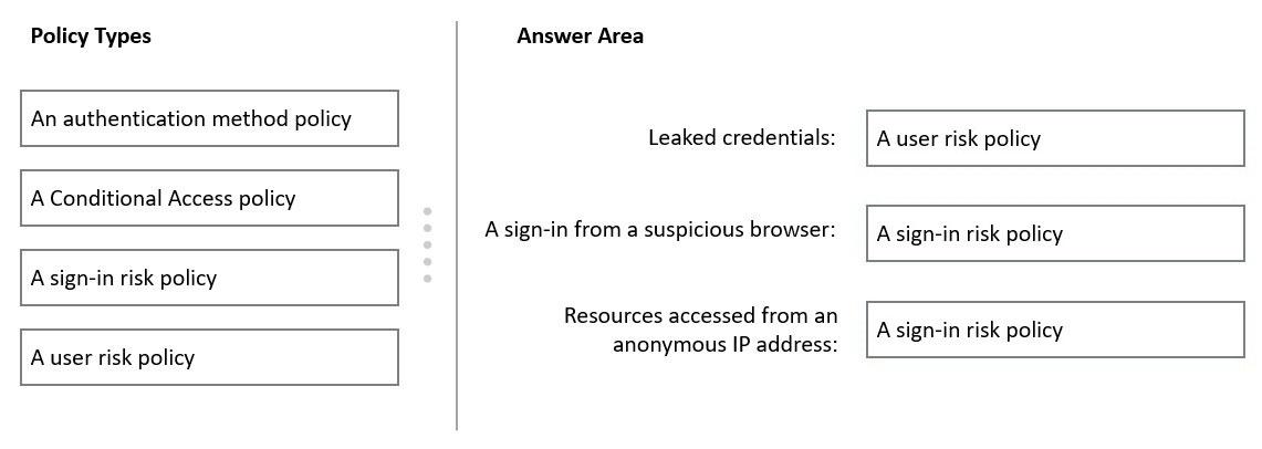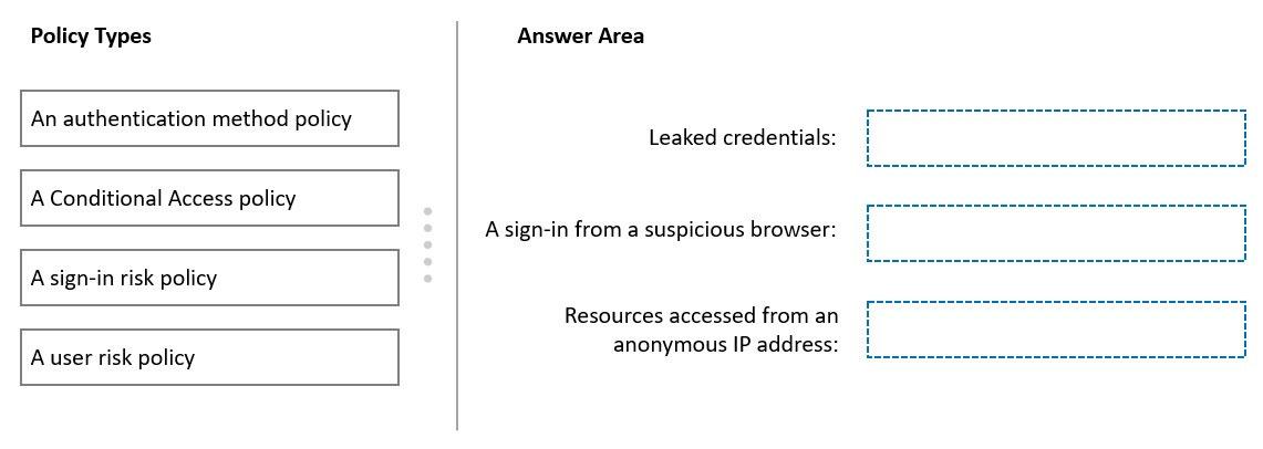 What should you configure for each incident? To answer, drag the appropriate policy types to the correct issues. Each policy type may be used once, more than once, or not at all. You may need to drag the split bar between panes or scroll to view content.