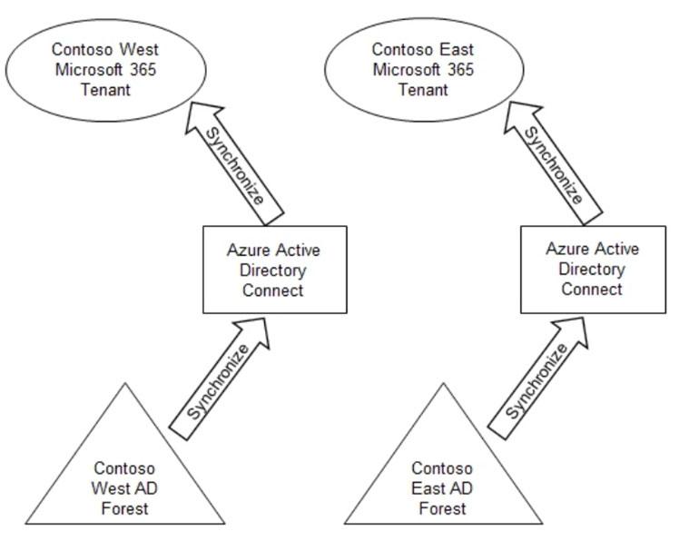 Your company has two divisions named Contoso East and Contoso West. The Microsoft 365 identity architecture for both divisions is shown in the following exhibit.