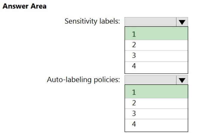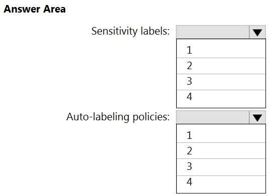 What is the minimum number of sensitivity labels and auto-labeling policies you should create? To answer, select the appropriate options in the answer area.