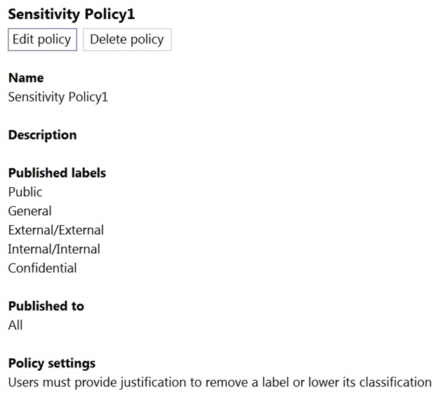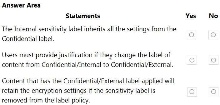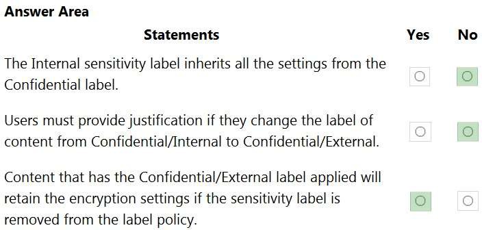 The Confidential/External sensitivity label is configured to encrypt files and emails when applied to content. The sensitivity labels are published as shown in the Published exhibit.