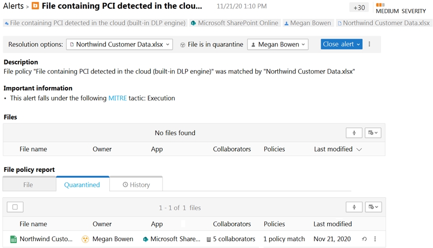 A user reports that she can no longer access a Microsoft Excel file named Northwind Customer Data.xlsx. From the Cloud App Security portal, you discover the alert shown in the exhibit.