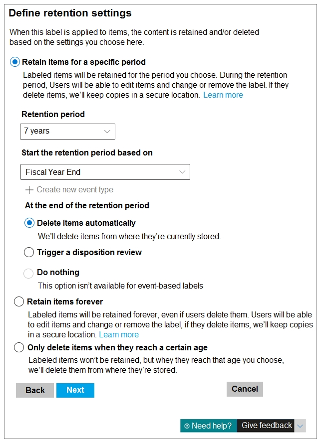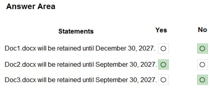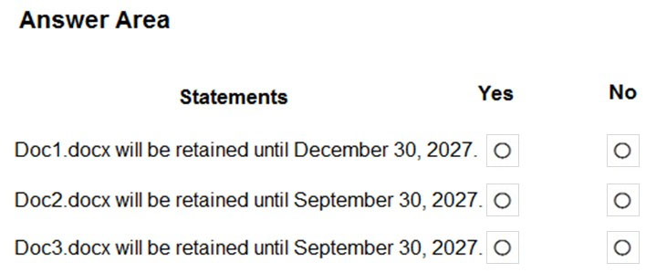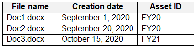 Users apply the retention label policy to files and set the asset ID as shown in the following table.
