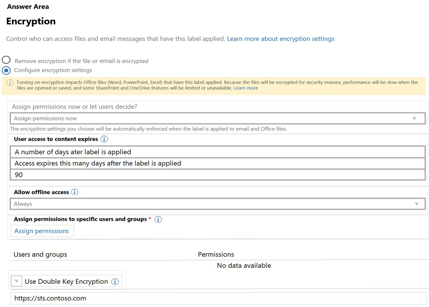 Let users assign permissions when they apply the label and the checkbox In Word, PowerPoint, and Excel, prompt users to specify permissions is selected. This configuration is sometimes referred to as "user-defined permissions".