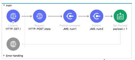 The flow can be described as below. 1) First HTTP POST requets is made in which paylaod is set to 1 and it gets returned to our mail flow. 2) Second call is initiated for JMS Publish Consume JMS: num1 which add 1 to the payload which makes it as 2. Note that pubih consume is a synchronous operation. Hence paylaod is returned to main flow. 3) Third call is initiated for JMS Publish JMS: