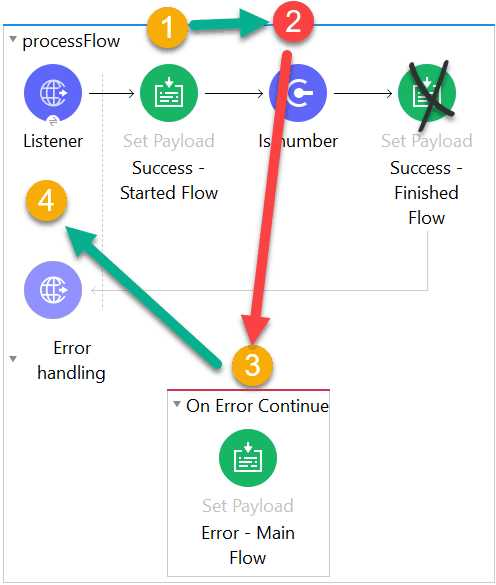 4) "Error" is returned to the requestor in the body of the HTTP request with HTTP Status Code: 200 as On error continue always sends success error code.