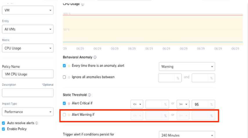 If you select Behavioral Anomaly as the threshold type, you cannot set a warning level for the alert. You can only set a critical level that indicates how much deviation from normal behavior is considered an anomaly3. Therefore, the Alert warning if field is greyed out when you select Behavioral Anomaly.