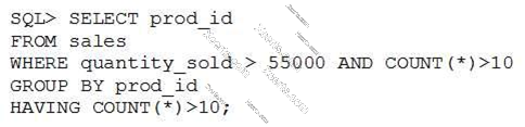 The following query is written to retrieve all those product IDs from the SALES table that have more than 55000 sold and have been ordered more than 10 items.