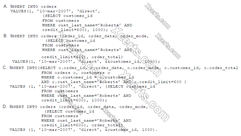 There is only one customer with the cust_last_name column having value Roberts. Which INSERT statement should be used to add a row into the ORDERS table for the customer whose CUST_LAST_NAME is Roberts and CREDIT_LIMIT is 600?