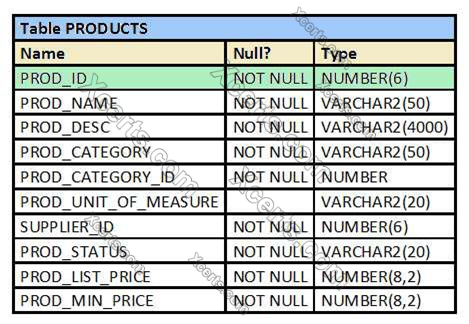 View the Exhibit and examine the structure of the PRODUCT table.