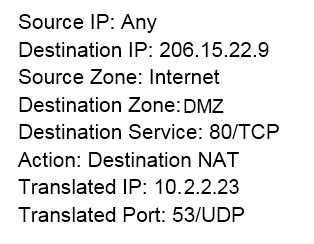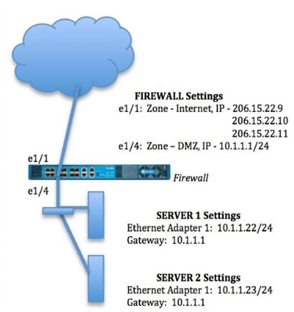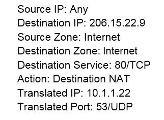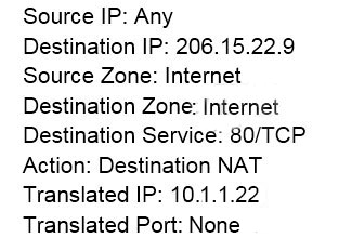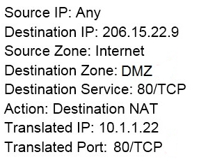 An administrator wants multiple web servers in the DMZ to receive connections initiated from the internet. Traffic destined for 206.15.22.9 port 80/TCP needs to be forwarded to the server at 10.1.1.22