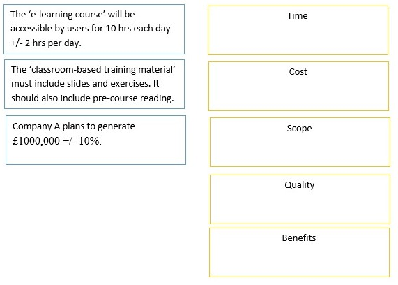 Here are three statements related to tolerances for the Health and Safety Training Project. For each statement, select the tolerance area (A-E) it represents.