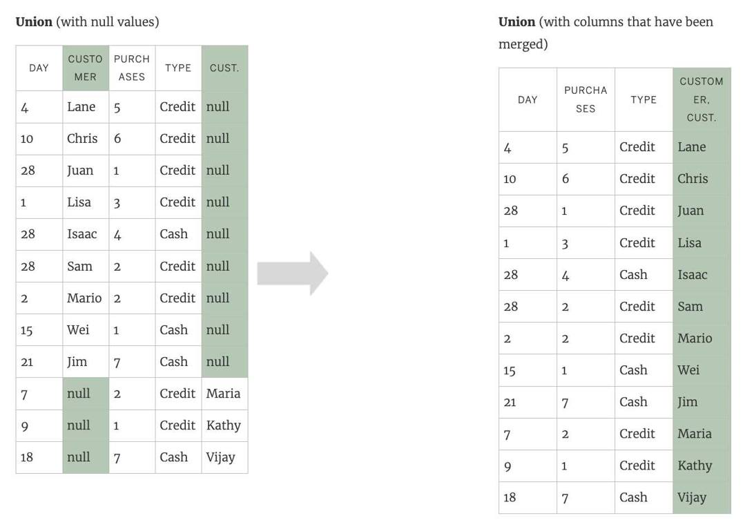 When field names in the union do not match, fields in the union contain null values. You can merge the non-matching fields into a single field using the merge option to remove the null values.