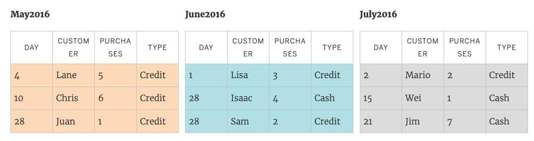 For example, suppose you have the following customer purchase information stored in three tables, separated by month. The table names are "May2016," "June2016," and "July2016."