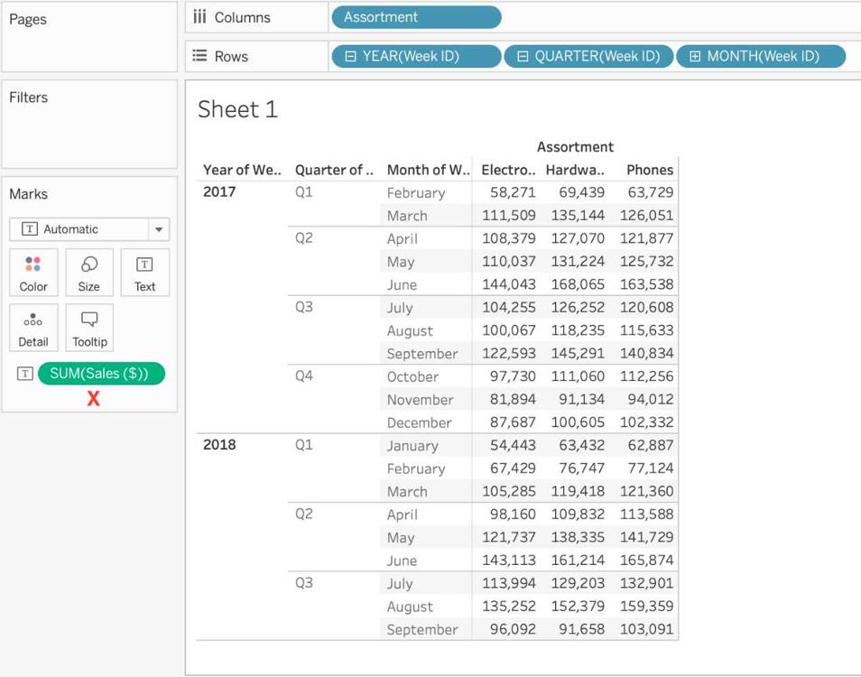 1) Draw Assortment to the Column shelf, and drag Year to the Rows Shelf. Then Drill down further on Year to accomodate Quarters and Months as well!