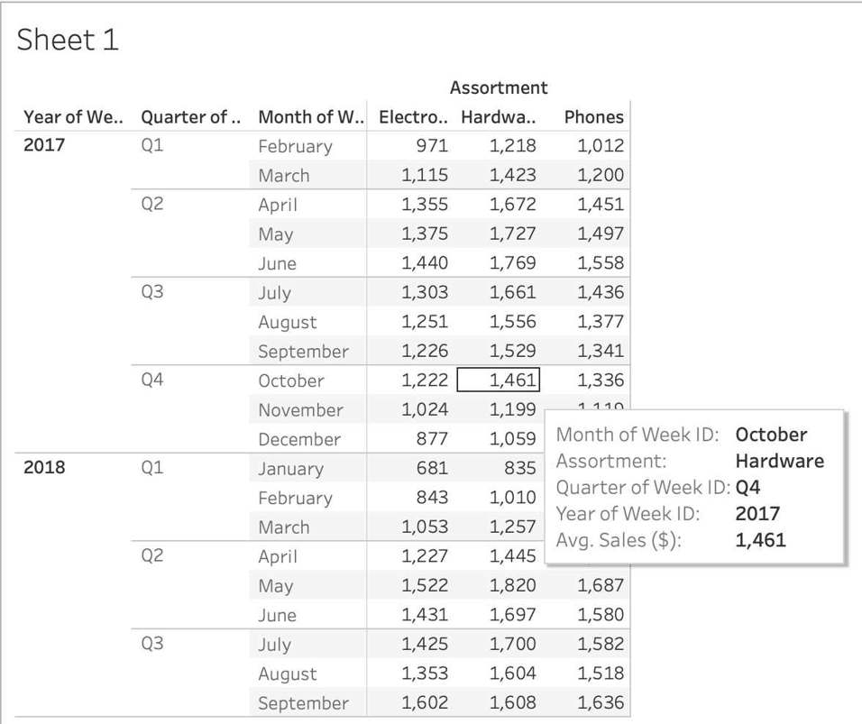 Using the Time Series table, create a cross-tab showing sales for each Assortment broken down by Year and Quarter. In Q4 of October 2017, what was the Average sales amount for the Hardware assortment?