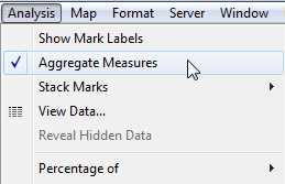 Whenever you add a measure to your view, an aggregation is applied to that measure by default. This default is controlled by the Aggregate Measures setting in the Analysis menu. If you decide you want to see all of the marks in the view at the most detailed level of granularity, you can disaggregate the view. Disaggregating your data means that Tableau will display a separate mark for every data value in every row of your data source.