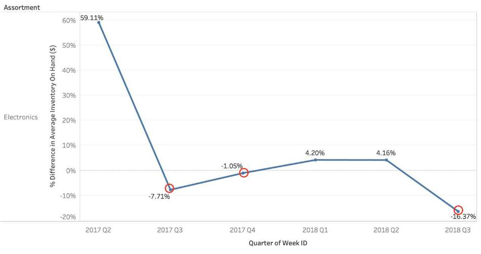 How many quarters did the Electronics Assortment show a negative percent difference in the Average Inventory On Hand?