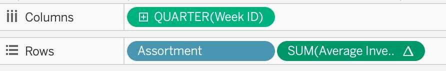 Using the Time Series table, create a chart that shows the percent difference in Average Inventory on Hand for each Assortment by year and quarter.