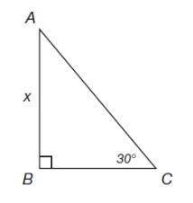 From the diagram, if the measure of angle C is 30 degrees and angle B is a right angle, then ABC is a 30— 60—90 right triangle. Using statement (1), if the measure of BC is 2 , then the shortest side x must be , which reduces to 2. Using statement (2), if the length of AC is 4 and AC is the hypotenuse of the triangle, then the shortest side of the triangle x is equal to 4/2= 2. Either statement is sufficient.